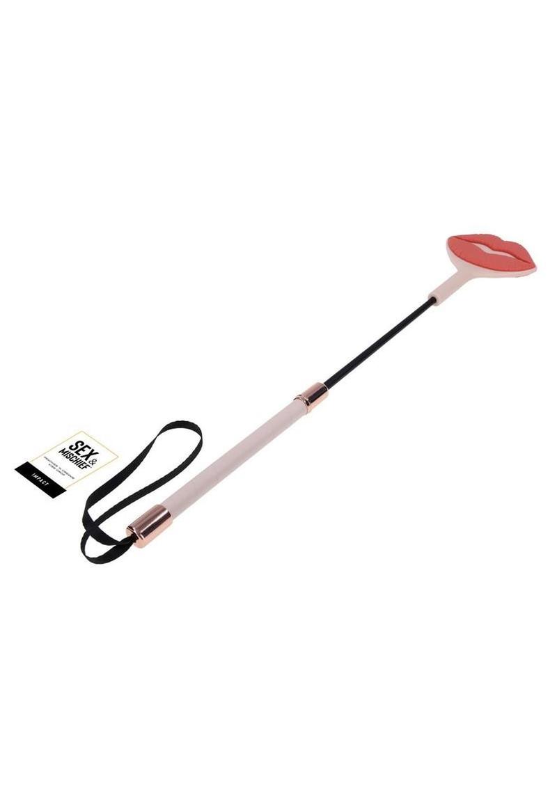 Seal the deal with a kiss they won’t forget. The Peaches ‘N CreaMe Kiss Crop features a soft, 100% silicone tip with a raised lip design that leaves a juicy kiss imprint with every well-aimed swat. The flexible yet firm tip delivers a sharp, satisfying sting that lingers on the skin and even longer in their memory. Adorned with gleaming rose gold accents and wrapped in peachy faux leather, the handle feels just as good in your grip as it looks. A matching wrist loop makes storage simple and impromptu play irresistible. With its flirty design and striking bite, this crop leaves a sensual mark that says, loud and clear: you were here.
